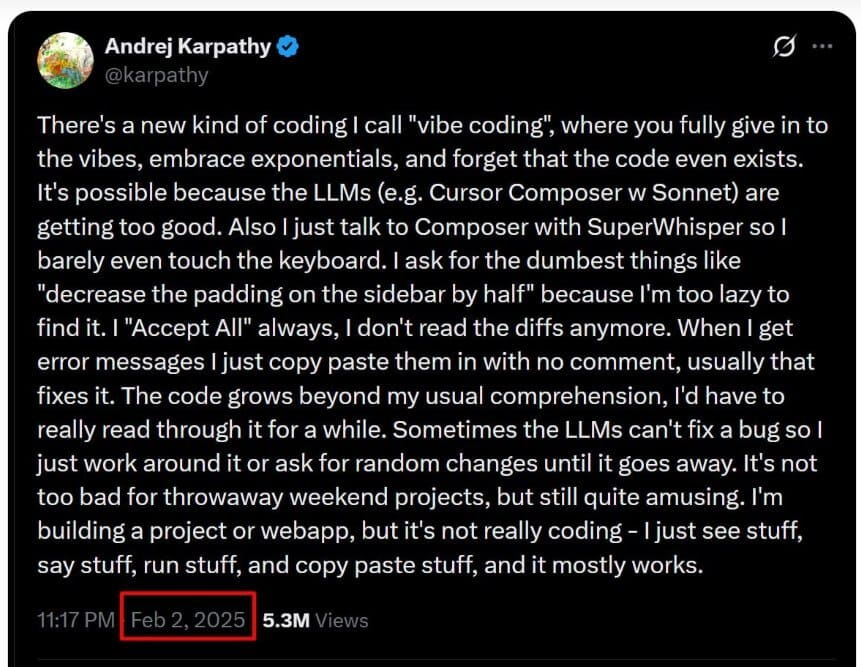 Перевод: «Есть новый вид программирования, который я называю “vibe coding” - когда ты полностью отдаешься вайбу, принимаешь экспоненты и забываешь, что код вообще существует.