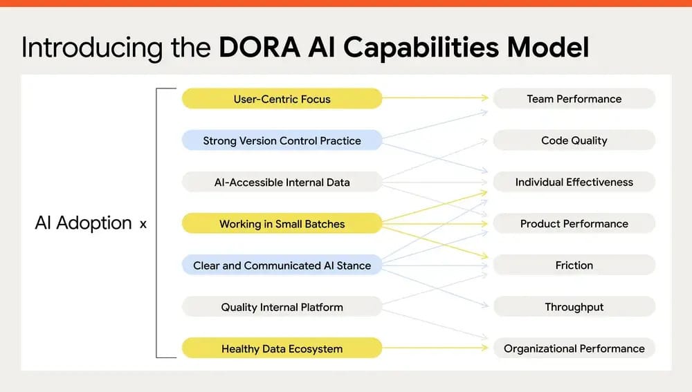 Чтобы это давало стабильную пользу, Google описал DORA AI Capabilities Model — семь практик вокруг ассистентов. Ответственность за финальное решение у людей. Выгода появляется там, где есть системный контур, а не красивый демо-ролик.