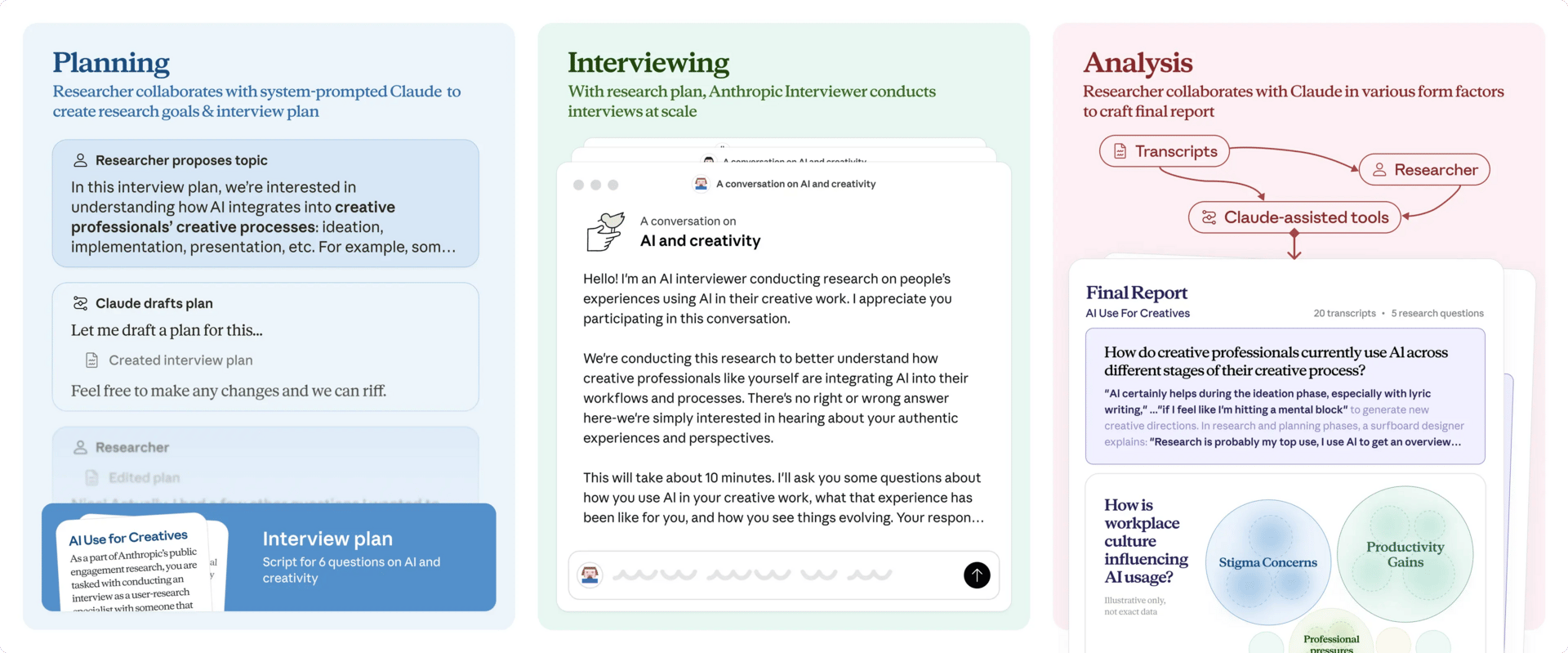 Что случилось: Anthropic запустил Anthropic Interviewer - инструмент на базе Claude, который закрывает весь цикл качественного исследования: сам планирует гайд, проводит интервью и помогает разбирать массив ответов.